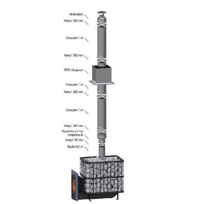 Готовый комплект дымохода, рассчитанный на монтаж через кровлю на расстояние до 4м.